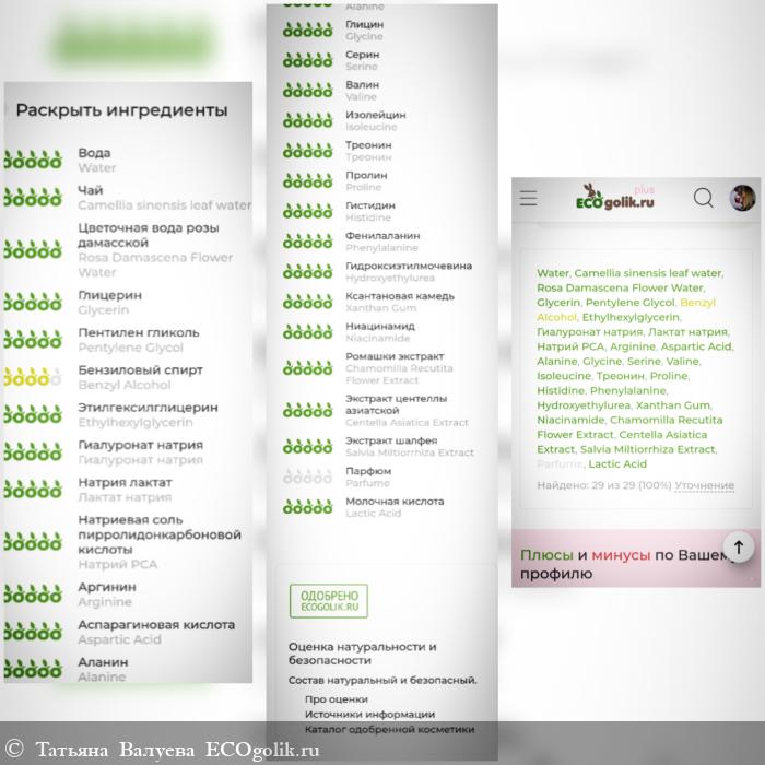 Water (Вода), Camellia sinensis leaf water (Гидролат зелёного чая), Rosa Damascena Flower Water (Гидролат розы дамасской), Glycerin (Глицерин), Pentylene Glycol (Пентилен гликоль), Benzyl Alcohol (Бензиловый спирт), Ethylhexylglycerin (Этилгексилглицерин), Sodium Hyaluronate (Гиалуронат натрия), Sodium Lactate (Лактат натрия), Sodium Рса (Натрий РСА), Arginine (Аргинин), Aspartic Acid (Аспаргимовая кислота), Рса Alanine (Аланин), Glycine (Глицин), Serine (Серин), Valine (Валин), Isoleucine (Изолейцин), hreonine (Трионин), Proline (Пролин), Histidine (Гистидин), Phenylalanine (Фениланин), Hydroxyethylurea (Гидроксиэтилмочевина), Xanthan Gum (Ксантановая камедь), Niacinamide (Ниацинамид), Chamomilla Recutita Flower Extract (Экстракт ромашки), Centella Asiatica (gotu Kola) Extract (Экстракт центеллы азиатской), Salvia Miltiorrhiza Extract (Экстракт шалфея), Perfume (Парфюмерная композиция). Lactic Acid (Молочная кислота)
