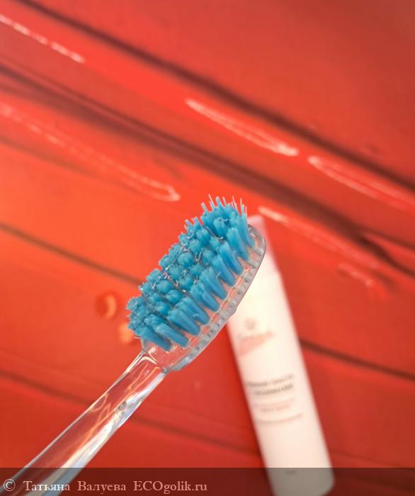 Так как текстура пасты средней густоты, то она не сильно пенится, что мне понравилось, ведь это создаёт ощущение мягкости при чистке зубов. Аромат пасты приятный, сладковатый, но не приторный, и это делает процесс чистки зубов более приятным