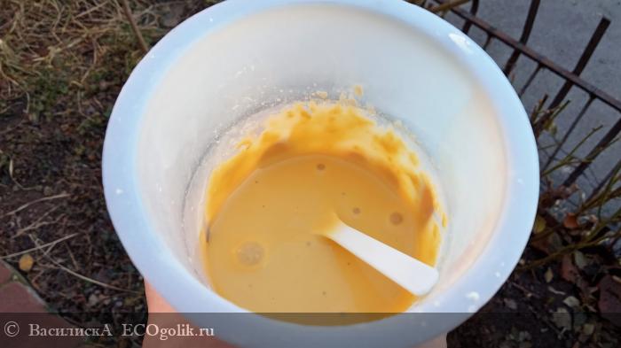 Порошка для маски насыпаю все-таки не 20, а 15 граммов. Чтобы потеков было меньше, важно точно отмерить воду – соотношение должно быть не больше, чем 3 (жидкость) к 1 (порошок). Ориентируемся, чтобы после размешивания получилась консистенция как у густой сметаны.