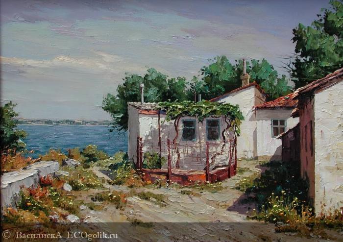 В отзыве использована картина «Домики у моря», которую написал в 2008 году российский художник Сергей Владимирович Григораш (родился в 1963 году)