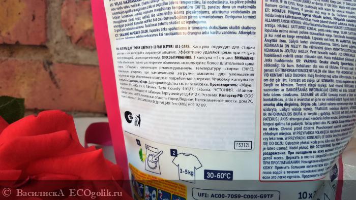 Капсулы предназначены для стирки цветных и темных вещей в стиральной машине. Потребительская информация о них помещена на тыльной стороне пакета