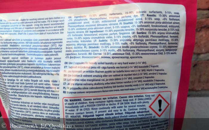 Состав содержимого капсул по традиции описан предельно кратко. Кроме анионных и неионогенных ПАВ, средства содержат мыло, фосфонат, феноксиэтанол, энзимы, ароматизатор и краситель.