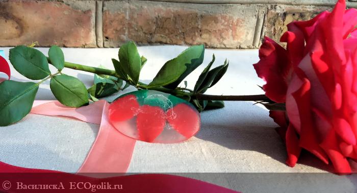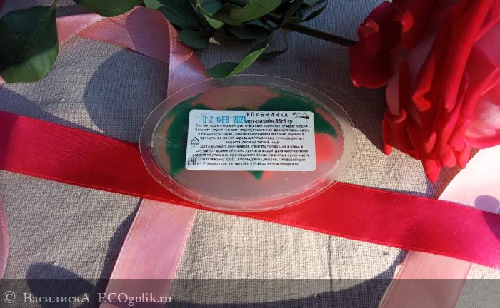Овальный брусок массой 85 граммов как будто отлит из полупрозрачного стекла, в толще которого спрятаны три красные ягоды клубники, как будто только что сорванные с веточки, и три свежих зеленых листика. При виде такого мыла хочется поскорее добраться до этих манящих ягод