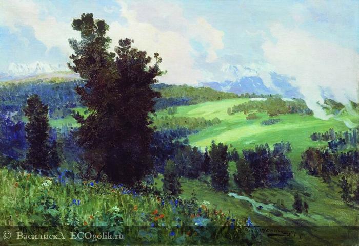 На прощание - алтайский пейзаж, написанный в 1909 году русским художником Григорием Ивановичем Гуркиным (1870-1937). Называется он «Алтай. Горная долина».