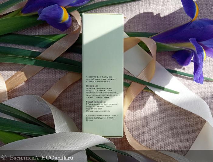 . Расход у продукта совсем небольшой - на весь участок кожи вокруг глаз (включая область подвижного века) достаточно 1-2 капель сыворотки.
