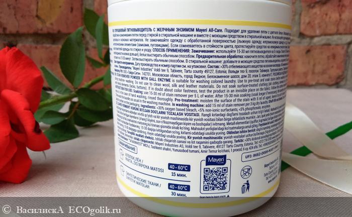 . В живом организме энзимы запускают обмен белков, жиров и углеводов, а в пятновыводителе Mayeri будут растворять пятна, не повреждая ткань и ее красители — пятновыводитель подходит и для цветного белья.