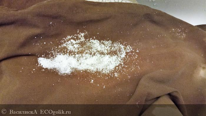 Как ни странно, пятновыводитель Mayeri , попавший на мокрую ткань и смоченный сверху водой, не торопится растворяться. В аналогичных случаях другие порошковые пятновыводители сразу превращались в мылкую кашицу.