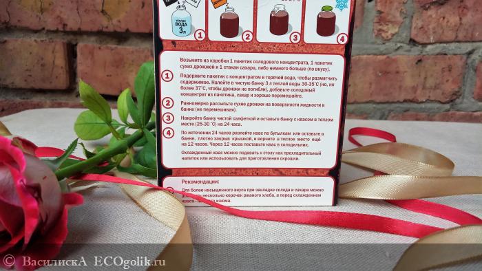 Внутри картонной коробки находятся по два герметичных пакетика дрожжей и концентрата квасного сусла. Каждая пара рассчитана на изготовление трех литров напитка. Кроме этого, вам потребуются три литра чистой воды - фильтрованной либо бутилированной, стакан сахара или больше (по вкусу), также по желанию можно добавлять корочку ржаного хлеба и изюм.