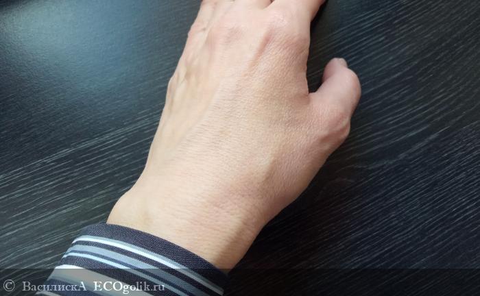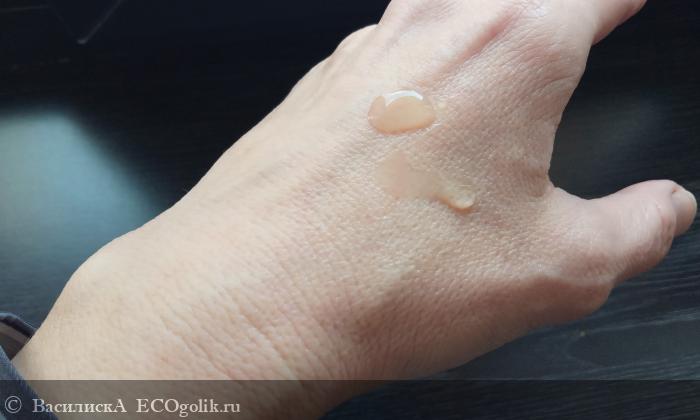 Во флаконе жидкость имеет бежево-желтый цвет, но на коже капли выглядят абсолютно прозрачными. Хотела написать «как вода», но это не совсем верно: тонер более вязкий, его капли не так подвижны и стекают медленнее.