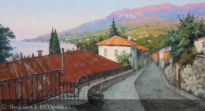 Картина в отзыве, конечно же, крымская. Она называется «Утро в Гурзуфе», написал ее российский художник Сергей Владимирович Григораш (родился в 1963 году)