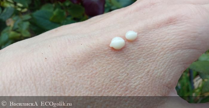 Дозатор работает плавно, реагирует на легкое нажатие и выдает крем вот такими маленькими порциями. Хочется сказать «каплями», но это будет неправильно, потому что крем Nanoorganic не жидкий и не текучий (спасибо «зеленому»