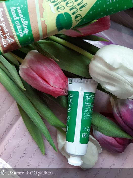 Упаковка у крема свежего зеленого цвета с изображением кусочка пирога. На обратной стороне мелким шрифтом указана информация о потребностях кожи рук, свойствах крема, способе применения, составе, контактных данных производителя, сроки пропечатаны отчетливо на обертке.