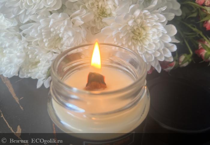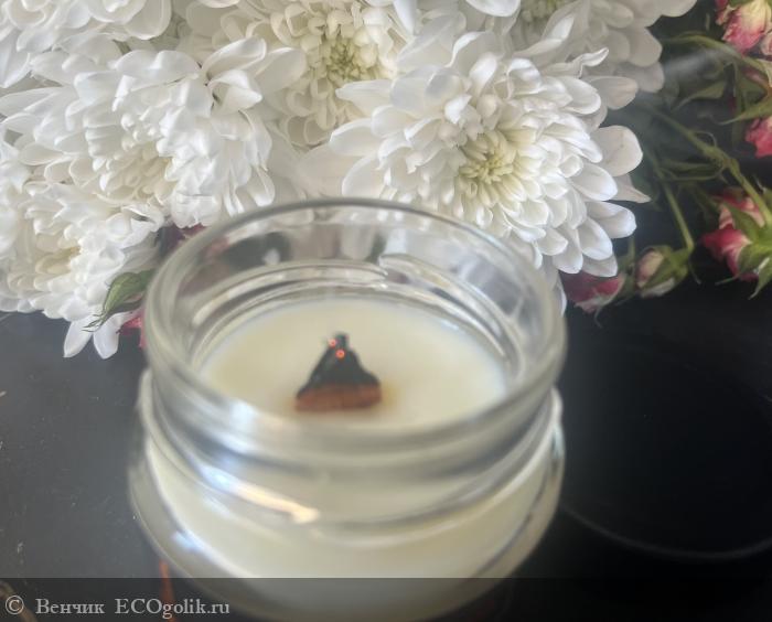 Натуральный состав: свеча изготовлена из высококачественного соевого воска и соевого масла, обеспечивая длительное и чистое горение без выделения вредных веществ.