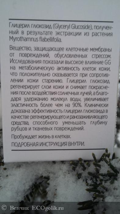 Активное вещество: Глицерил глюкозид -производное глицерина, используется для лечения сухой кожи. Увлажняет кожу внутри эпидермиса, за счет образования водородных связей с водой. Действие глицерил глюкозида направлено на связывание и удержание воды в коже, при этом он проникает в эпидермис и снижает ТЭПВ (трансэпидермальная потеря воды).