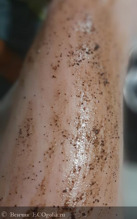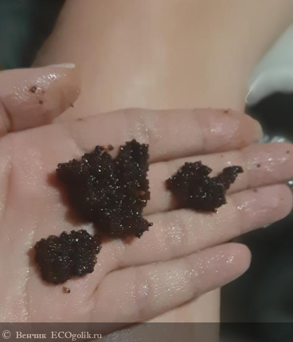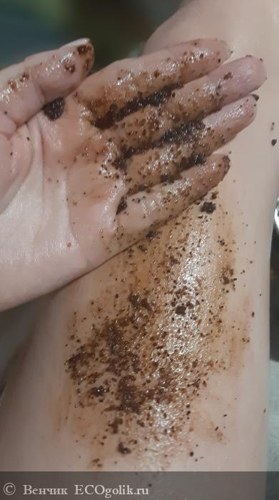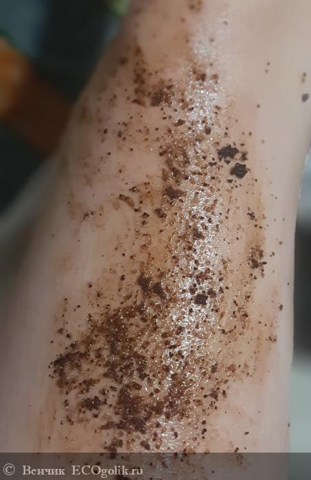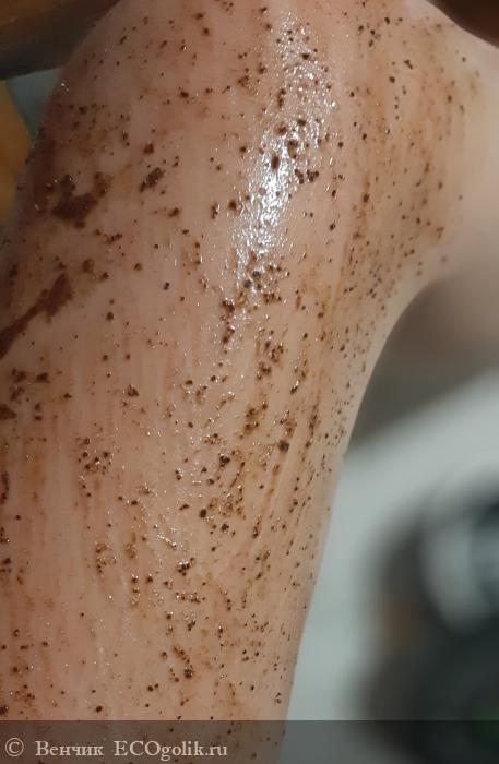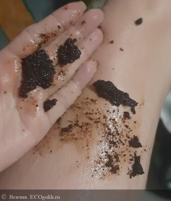 Скраб смывается не на раз - два. Это все таки кофе и его придется смыть более тщательно, особенно в зонах складок, а так все нормуль.