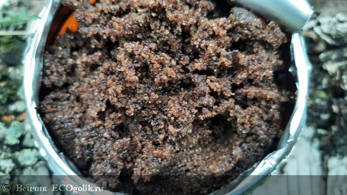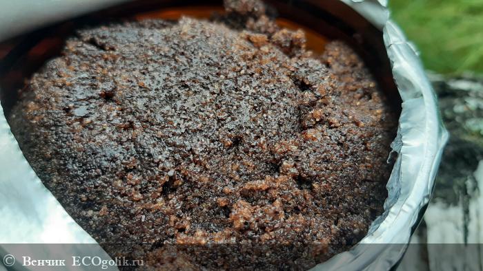 Скраб выглядит чересчур аппетитным. Глядя на него слюни текут, эдакий кофейный десерт типа кекса