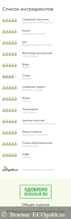Сахар, кофе молотый, масло какао, какао тертое, масло карите, масло виноградной кости, вода, спирт, лаурат сахарозы, экстракты фукуса (водоросли), ламинарии (водоросли), конского каштана (лист), хвоща (трава), плюща (побега), кофе (зерна).