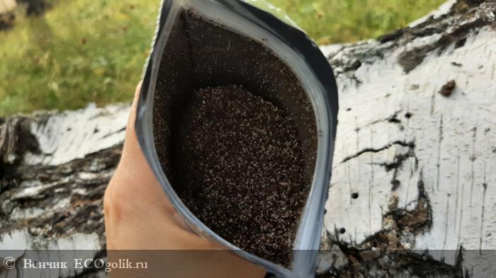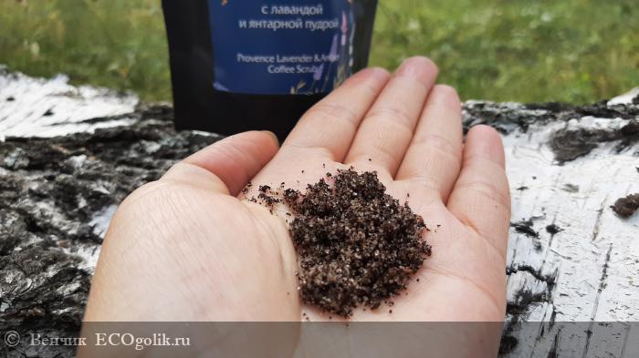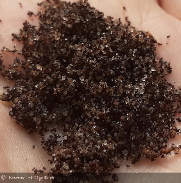 Скраб представляет рассыпчатую и мелкую кофейную текстуру с крупинками соли, сахара и янтарной пудрой