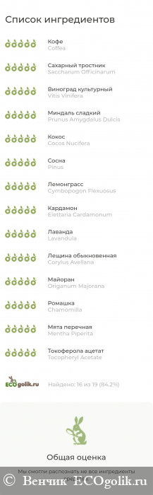 Состав суперский, и масла, и экстракты, и витамины, основными ингредиентами в роли скрабирующих частичек выступают кофе и соль с сахаром.