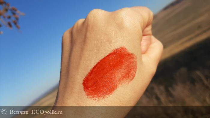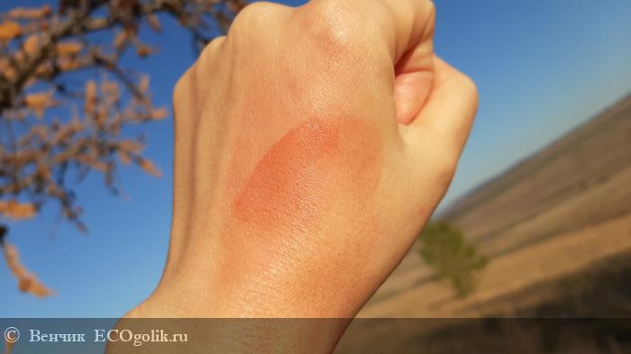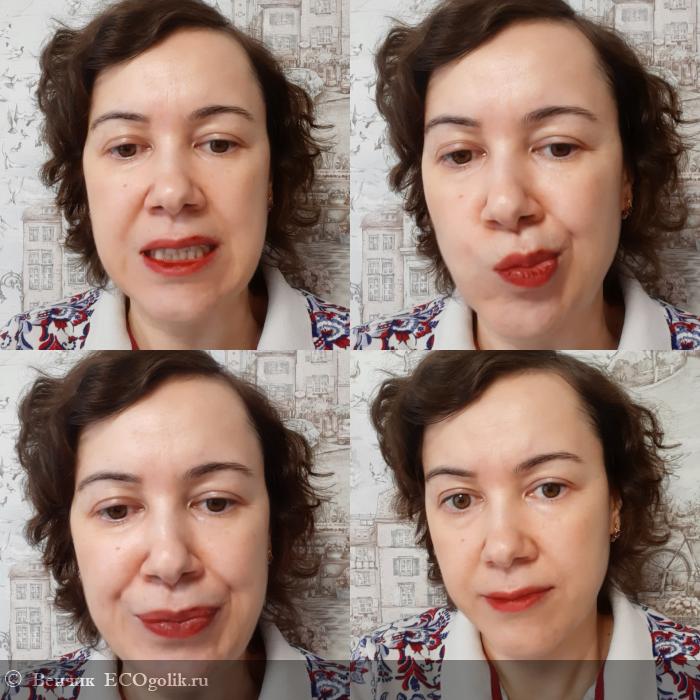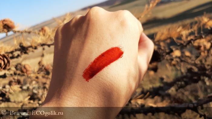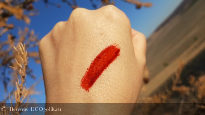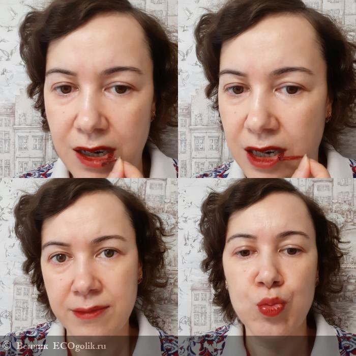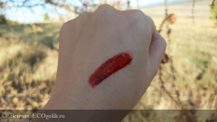Оттенок конечно интересный, но для него нужны идеальные губы. Мои обветренные, с ранками и тинт словно проваливается в ранки, в итоге оттенок смотрится уже по-разному. На не пораненных участках красным цветом, на ранках кровавым цветом лежит. Минус еще при попадании в ранки сильно щиплет, неприятно.