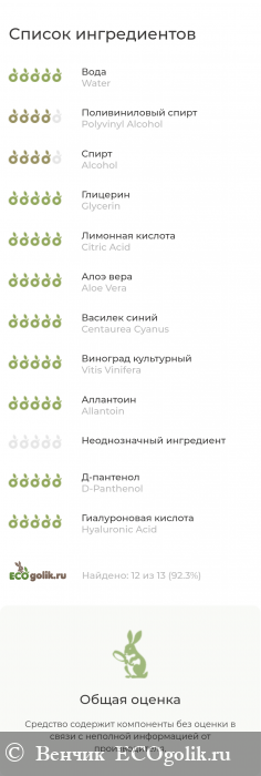 Вода, поливиниловый спирт, этанол, глицерин, лимонная кислота, алоэ вера, василек, виноград, пшеница, аллантоин, минеральный пигмент, д-пантенол, гиалуроновая кислота