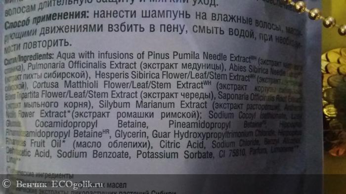 Акцент на два ингридиента на упаковке: Кедровый стланик содержит аминокислоты, которые обладают способностью восстанавливать структуру поврежденного волоса, придавая прическе естественный объем и пышность. Четыре витамина А, В, С, Е, содержащиеся в таежной медунице, обеспечивают волосам длительную защиту и мягкий уход.