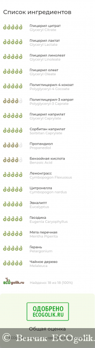 Но когда мы встретили коллегу с его семьей и они дико отмахивались каждый двумя руками от кровососов, я поняла, что мы ошиблись, муж так и сказал, а спрей - то работает. Так что он не на 100 % выполняет свои защитные функции, но на 90 точно, пример был перед глазами и видимо не ощутимый для нас отпугивающий и отталкивающий аромат не пугал только бесбашенных насекомых, ставлю 5, так как такой продукт в основном состоит из химии, здесь же безопасный состав, сам репеллент не ощущается на лице, не жирнит волосы (при умеренном нанесении), обновляла его всего лишь дважды за 2-х часовую прогулку, это очень хороший показатель.Большинство продукции ранее приходилось наносить каждые 15-20 минут.