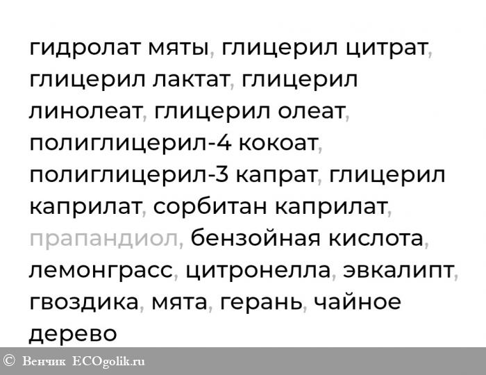 гидролат мяты, LEM (глицерил цитрат, глицерил лактат, глицерил линолеат, глицерил олеат, поли-глицерил-4, кокоат, полиглицерил-3 капрат, глицерил каприлат), (сорбитан каприлат и прапандиол и бензойная кислота), эфирные масла лемонграсс, цитронелла, эвкалипт, гвоздика, мята, герань, чайное дерево