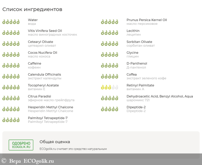 В дополнение к пептидному комплексу в креме присутствуют экстракт календулы, экстракт зеленого кофе. Календула успокаивает кожу. Зеленый кофе является натуральным подтягивающим средством.