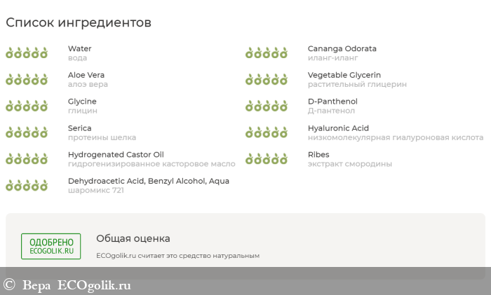 Другие очень полезные ингредиенты - это алоэ вера, гидролат иланг-иланга, протеины шелка, экстракт смородины. Консервант тут одобренный - шаромикс 721. Он полностью натуральный.