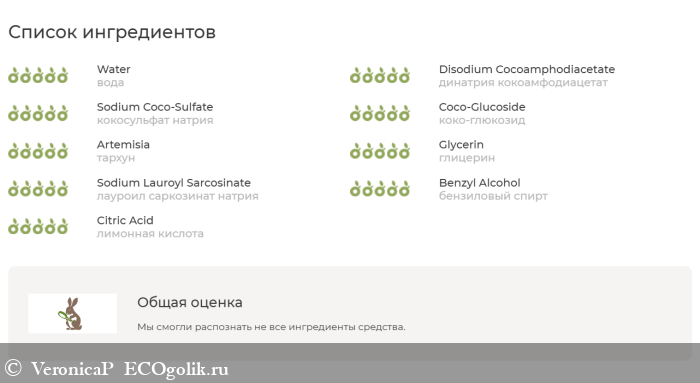 вода, динатрия кокоамфодиацетат, кокосульфат натрия, коко-глюкозид, гидролат тархуна, глицерин, лауроил саркозинат натрия, бензиловый спирт, этилгексилгрицерин, экстракт элеутерококка, лимонная кислота, композиция эфирных масел