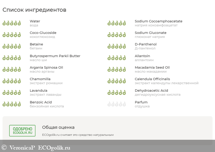 Специально подготовленная очищенная вода, натрия кокоамфоацетат, кокоглюкозид, глюконат натрия, бетаин, Д-пантенол, масло ши, аллантоин, масло арганы, масло макадамии, экстракт ромашки, экстракт календулы лекарственной, экстракт лаванды, дегидроуксусная кислота, бензойная кислота, пищевая отдушка с гипоаллергенным статусом