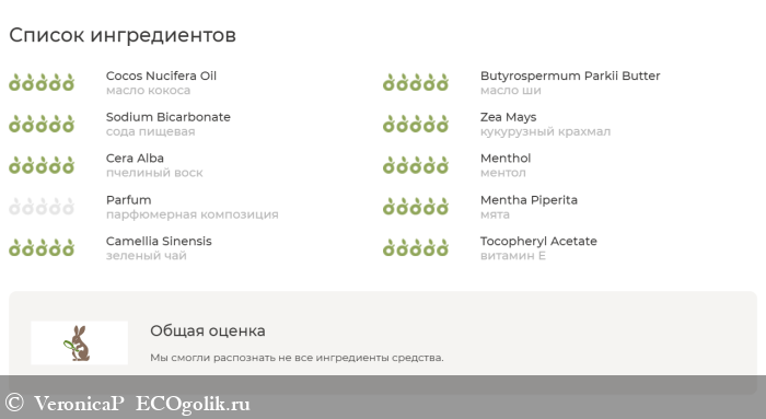 масло кокоса, масло ши, сода пищевая, кукурузный крахмал, пчелиный воск, ментол, парфюмерная композиция, SC-CO2 экстракт мяты, SC-CO2 экстракт зеленого чая, витамин Е.