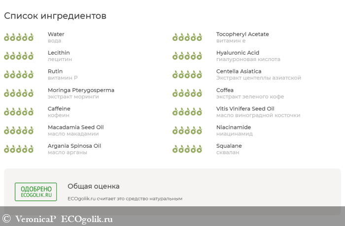 вода; витамин е; лецитин; гиалуроновая кислота; витамин Р; Экстракт центеллы азиатской; экстракт моринги; экстракт зеленого кофе; кофеин; масло виноградной косточки; масло макадамии; ниацинамид; масло арганы; сквалан