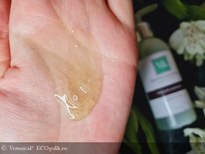 Текстура шампуня однородная, консистенция жидкая средней густоты (с ладони быстро не убегает).