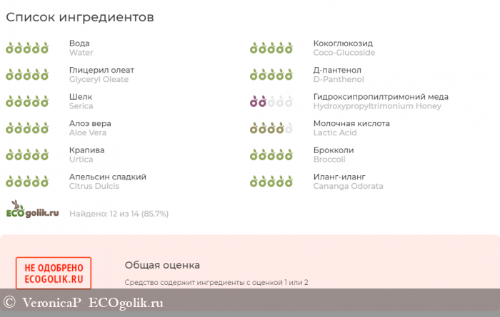 И если данные компоненты у меня не вызывают вопросов, то один опознанный компонент сервис проверки не одобрил и дал всего 2 яблочка. Это Гидроксипропилтримоний меда. Он имеет скитническое происхождение, увлажняет и смгячает волосы, служит кондиционером и антистатиком, может вызвать раздражение кожи.