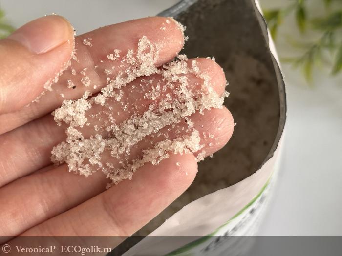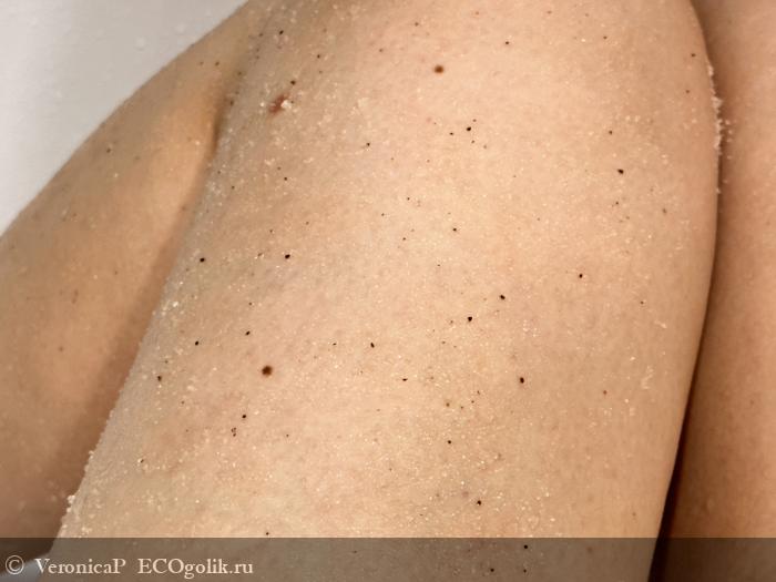 Скраб приятно распределяется по влажной коже, по минимуму осыпается в ванну. Мне нравится, что частички скраба не жесткие и не крупные. Он абсолютно не травмирует и не царапает кожу.