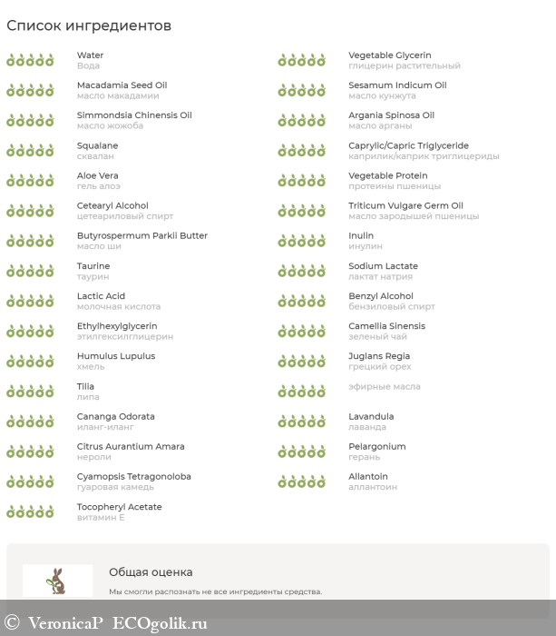 Вода, гидролат зеленого чая, глицерин растительный, масло макадамии, масло кунжута, пшеничный воск, масло жожоба, масло арганы, сквалан, каприлик/каприк триглицериды, гель алоэ, протеины пшеницы, цетеариловый спирт, масло зародышей пшеницы, масло ши, инулин, таурин, лактат натрия, молочная кислота, бензиловый спирт, этилгексилглицерин, экстракты: зеленый чай, хмель, грецкий орех, каштан, липа, эфирные масла: иланг-иланг, лаванда, нероли, герань, гуаровая камедь, аллантоин, гиалуронат натрия (гиалуроновая кислота 1600-50 кда.) А-липоевая кислота, витамин Е.