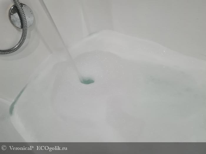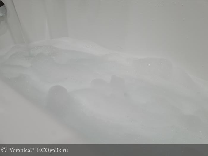 Пока набирается ванна, я сразу выливаю небольшое количество пены под струю воды. Так быстро получается обильная и пышная пена.