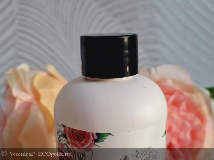 Продается пена в аккуратном небольшом пластиковом флаконе белого цвета. По его окружности приклеена этикетка. На лицевой стороне изображен логотип бренда, название продукта и красивые нежные розы.