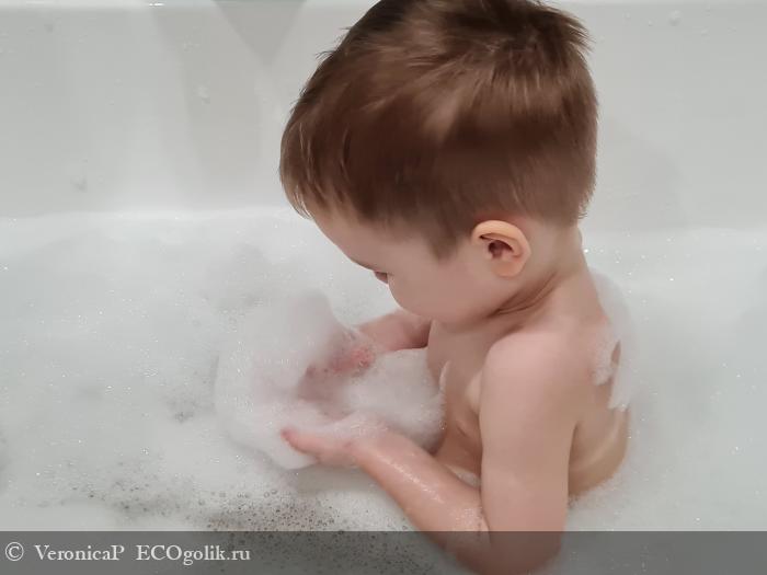Но не только я люблю принять ванну с пенкой. Мой двухлетний сын просто обожает её! Каждый день просится с ней купаться)) Пена хорошо держит форму и не оседает быстро, поэтому отлично подходит для детских игр. А поскольку у неё натуральный и безопасный состав, средство не сушит и не раздражает нежную кожу ребенка.