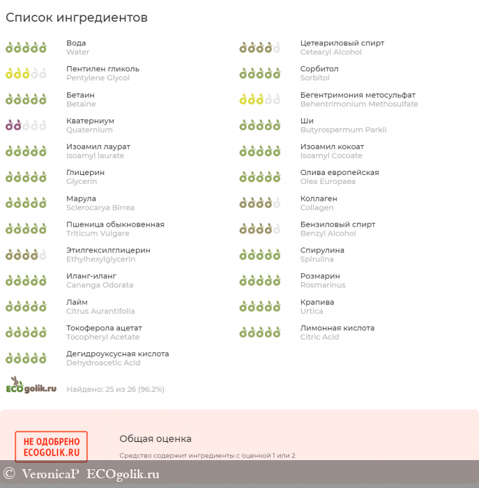 К сожалению, состав не оказался полностью натуральным. Среди компонентов есть кватерниум-87 (Quaternium-87). Он имеет синтетическое происхождение. Является эмульгатором, диспергатором, кондиционером для волос, смягчающим средством, антистатиком, защищает волосы и кожу головы от красителей при окрашивании волос. может вызвать раздражение на коже и при попадании в глаза, а также вызвать аллергическую реакцию.