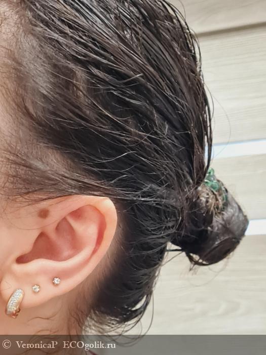 Наношу маску на чистые влажные волосы. Поскольку корни волос у меня не сухие, а наоборот жирные, то я наношу маску, отступая от корней несколько сантиметром. Тщательно распределяю её по всей длине, и побольше средства наношу на кончики волос.