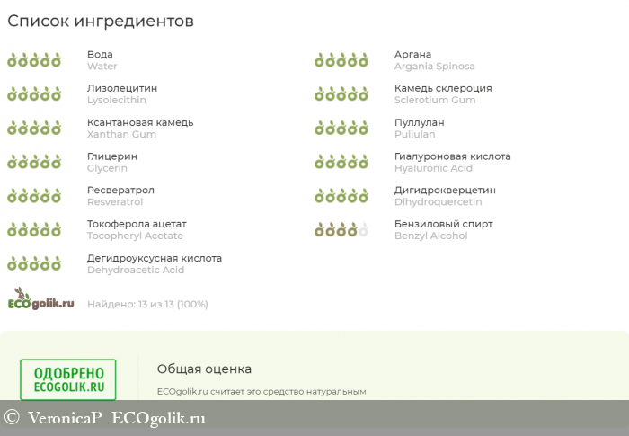 Состав (INCI): water, Argan oil, Lysolecithin, Sclerotium Gum, Xanthan Gum, Pullulan, Glicerin, HYALURONIC Acid, resveratrol, Dihydroquercetinum, DL–alpha Tocopheryl Acetate, Benzyl alcohol, Dehydroacetic acid.