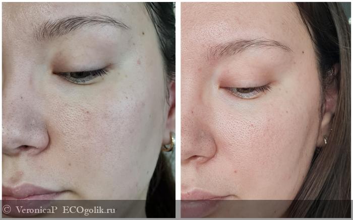 Тон кожи стал значительно ровнее, ушли покраснения, цвет лица стал более свежим, светлым и сияющим. Кожа на ощупь очень нежная, мягкая и гладкая. Сыворотка отлично питает и увлажняет её, насыщая полезными веществами. Увлажнение это совсем не поверхностное.