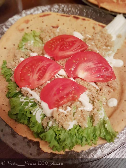 Vesta___Vesna: Чечевичная лепешка с киноа, помидорами и зеленью под соусом из миндаля.