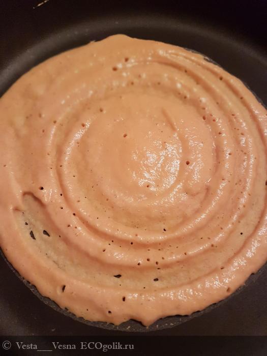 Полученную смесь круговыми движениями распределяем по сухой разогретой сковороде. Можете добавить масло, все зависит от покрытия вашей посуды.