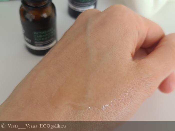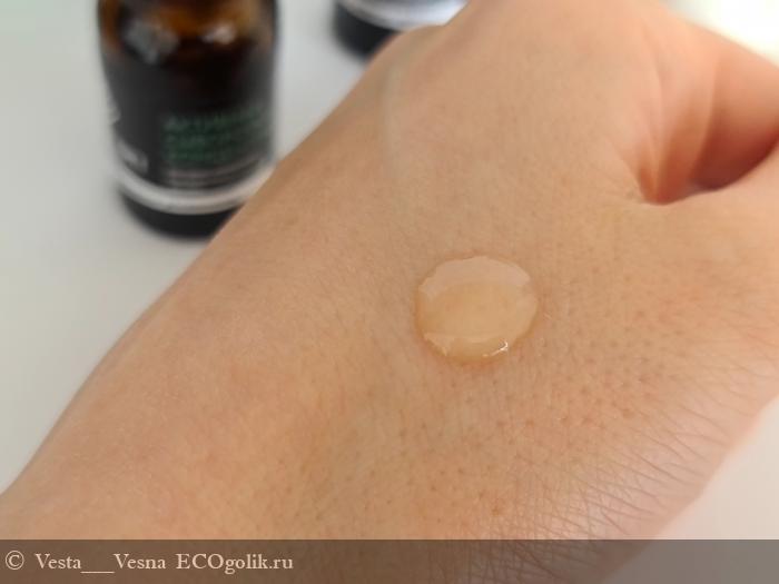 По консистенции сыворотка очень похожа с первой: водянистая, с легким намеком на гелеобразность, прозрачная, комфортная в нанесении. Не оставляет после себя липкости.