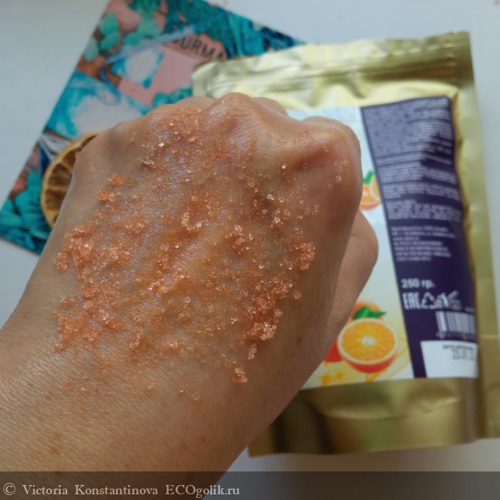 Я ощущаю сочный мандарин и нотку горького грейпфрута. Для меня, скраб НЕ имеет аромата апельсина или запаха эфирного масла апельсина. То есть аромат не апельсиновый