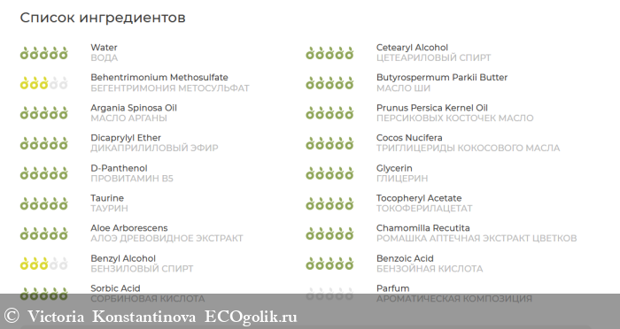 ВОДА, ЦЕТЕАРИЛОВЫЙ СПИРТ, БЕГЕНТРИМОНИЯ МЕТОСУЛЬФАТ, МАСЛО ШИ (КАРИТЕ), МАСЛО АРГАНЫ, ПЕРСИКОВЫХ КОСТОЧЕК МАСЛО, ДИКАПРИЛИЛОВЫЙ ЭФИР, ТРИГЛИЦЕРИДЫ КОКОСОВОГО МАСЛА, ПРОВИТАМИН В5 (Д-ПАНТЕНОЛ), ГЛИЦЕРИН, ТАУРИН, ТОКОФЕРИЛАЦЕТАТ, ПРОТЕИН ЗАРОДЫШЕЙ ПШЕНИЦЫ, АЛОЭ ДРЕВОВИДНОЕ ЭКСТРАКТ, РОМАШКА АПТЕЧНАЯ ЭКСТРАКТ ЦВЕТКОВ, БЕНЗИЛОВЫЙ СПИРТ, БЕНЗОЙНАЯ КИСЛОТА, СОРБИНОВАЯ КИСЛОТА, АРОМАТИЧЕСКАЯ КОМПОЗИЦИЯ.